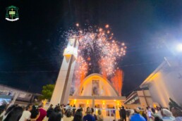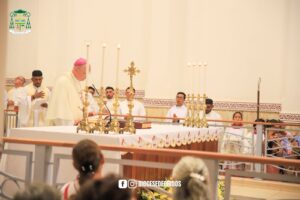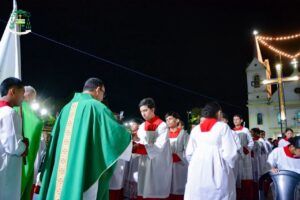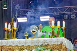 Na sequência, teve início a solene Celebração Eucarística de Dedicação do Altar da Igreja Matriz de Santa Isabel, presidida por Dom Bernardo Johannes, Bispo Diocesano de Óbidos, e concelebrada por Dom Giuliano, Bispo Emérito da Diocese de Parintins, pelo Padre Rodrigo Allan, pároco da Paróquia de Santa Isabel, e por mais 14 padres. Ao término da celebração, todos foram convidados para um grande jantar realizado na Praça da Matriz, onde a comunidade pode degustar um delicioso churrasco, preparado com muito carinho, celebrando este momento histórico e único para Terra Santa.